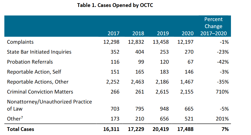 An SBI is not subject to the duties that come with investigations triggered by a complaint. They are also not subject to the five-year Rule of limitation set forth in State Bar Rule of Procedure 5.21. SBIs are separated tallied in the statistics contained in the State Bar’s Annual Discipline Report. In 2020: