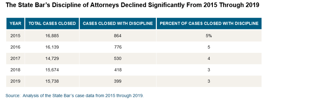 An SBI is often opened in response to information the State Bar receives through public sources, such as media accounts or judicial decisions. Judges who complain to the State Bar are sometimes given the option not to choose the status of “complainant” but have their complaint closed with the option of it being reincarnated as an SBI. Cases involving allegations or findings of prosecutor misconduct are often opened as SBIs (see 2020 Annual Discipline Report, footnote 33 at page SR-7.)